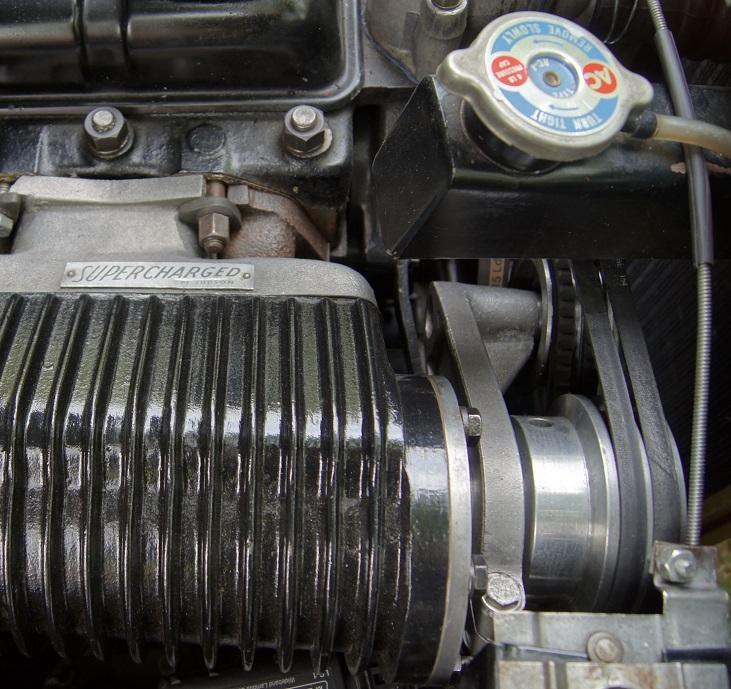 After a long search a complete TR2 engine with Judson supercharger was purchased in 2013. This was overhauled in 2013. After the engine of the TR2 was properly run in, this Judson will be installed at the end of 2013. Meanwhile until 2016 many thousands of kilometers driven. Recently, the Judson was subjected to an inspection in 2016. There are no signs of wear and tear on the Judson. At the beginning of 2016, a smaller pulley was installed to increase the compressor pressure slightly.